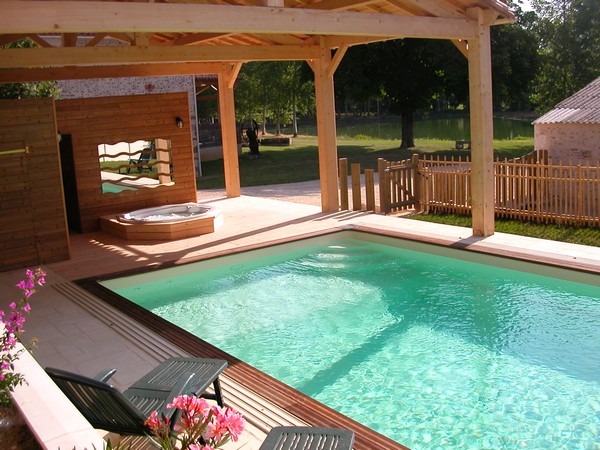 Un espace détente composée d'une piscine, d'une douche extérieure, d'un SPA et d'un sauna